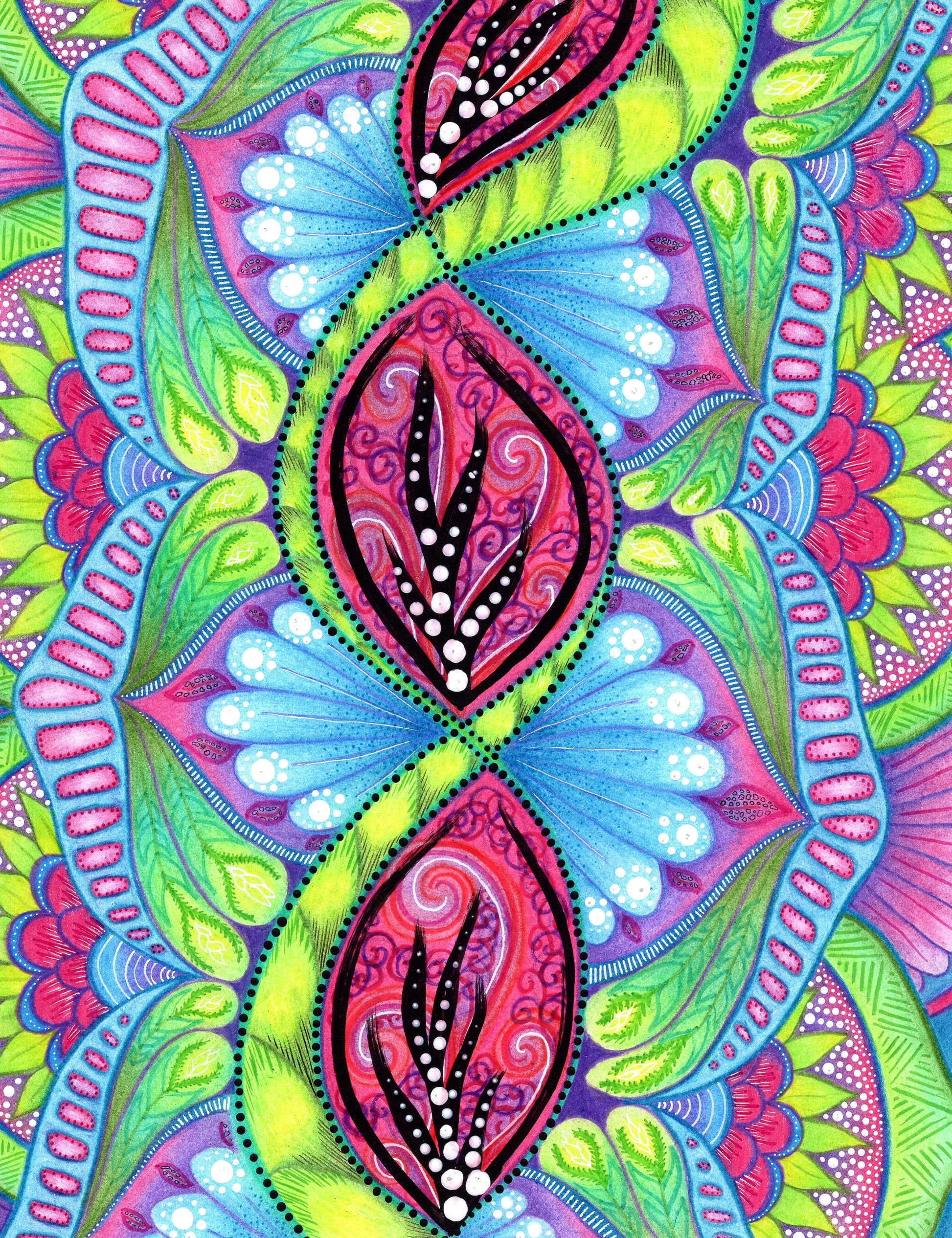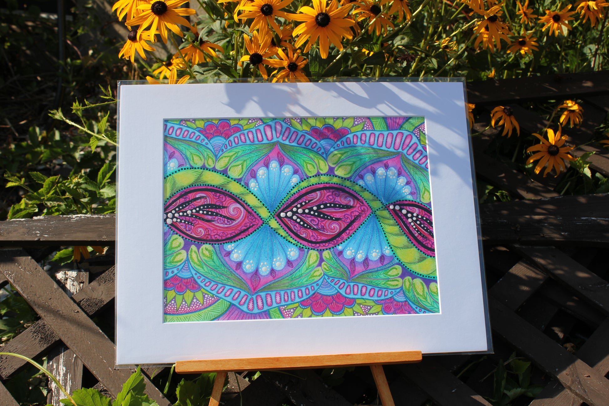 “Bounty” is an original drawing that bursts with color, weaving a double helix into a fluid, organic design enriched with subtle nods to nature. Bright, lively hues bring energy and depth to the composition, balancing scientific structure with natural forms. Matted to 11x14” with archival-quality materials for lasting preservation and effortless display.