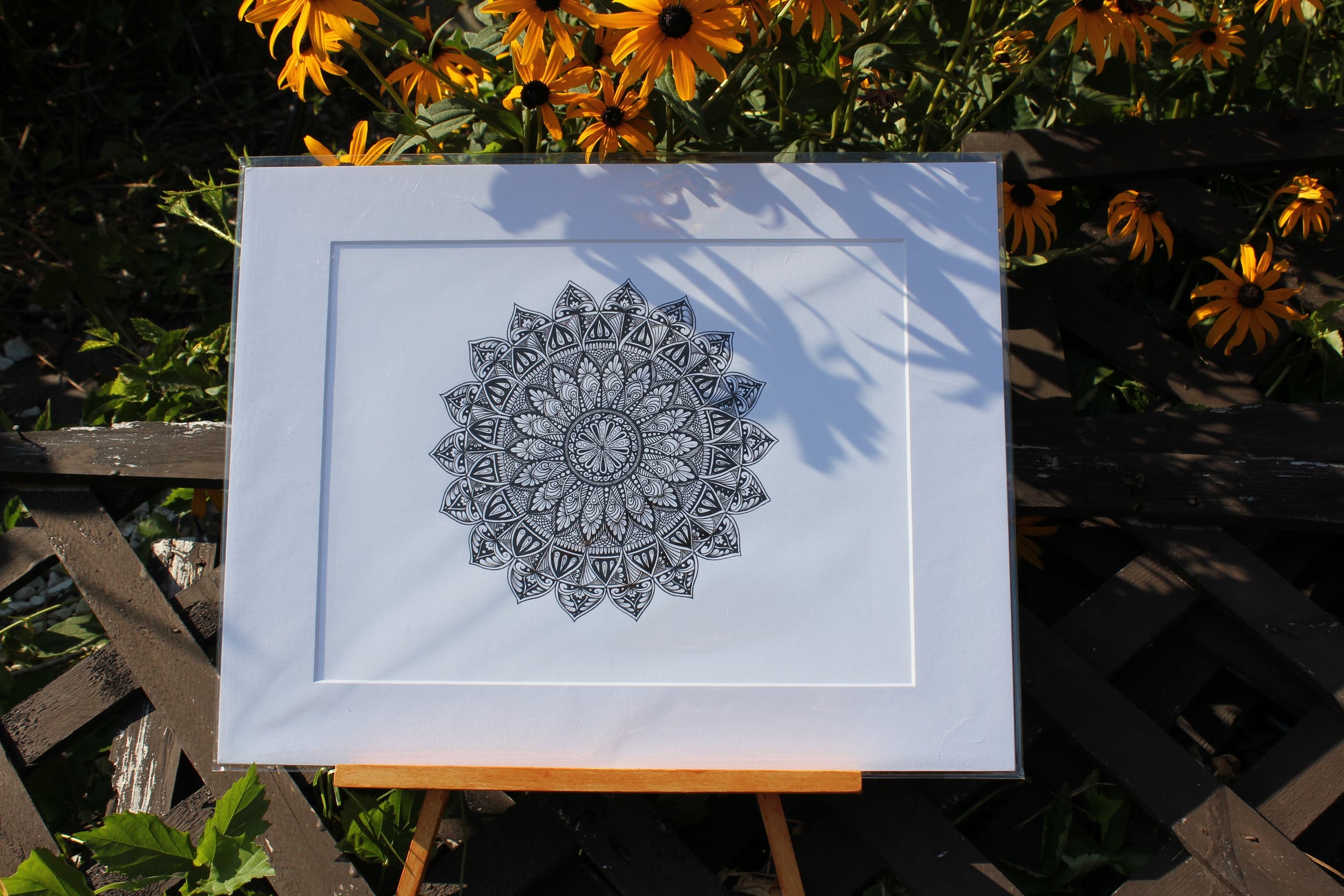“Ink Mandala I” is a detailed ink drawing featuring intricate patterns and precise linework. The composition emphasizes balance and symmetry, drawing the viewer’s eye across its structured, meditative forms. Matted to 11x14” with archival-quality materials for durability and easy display.