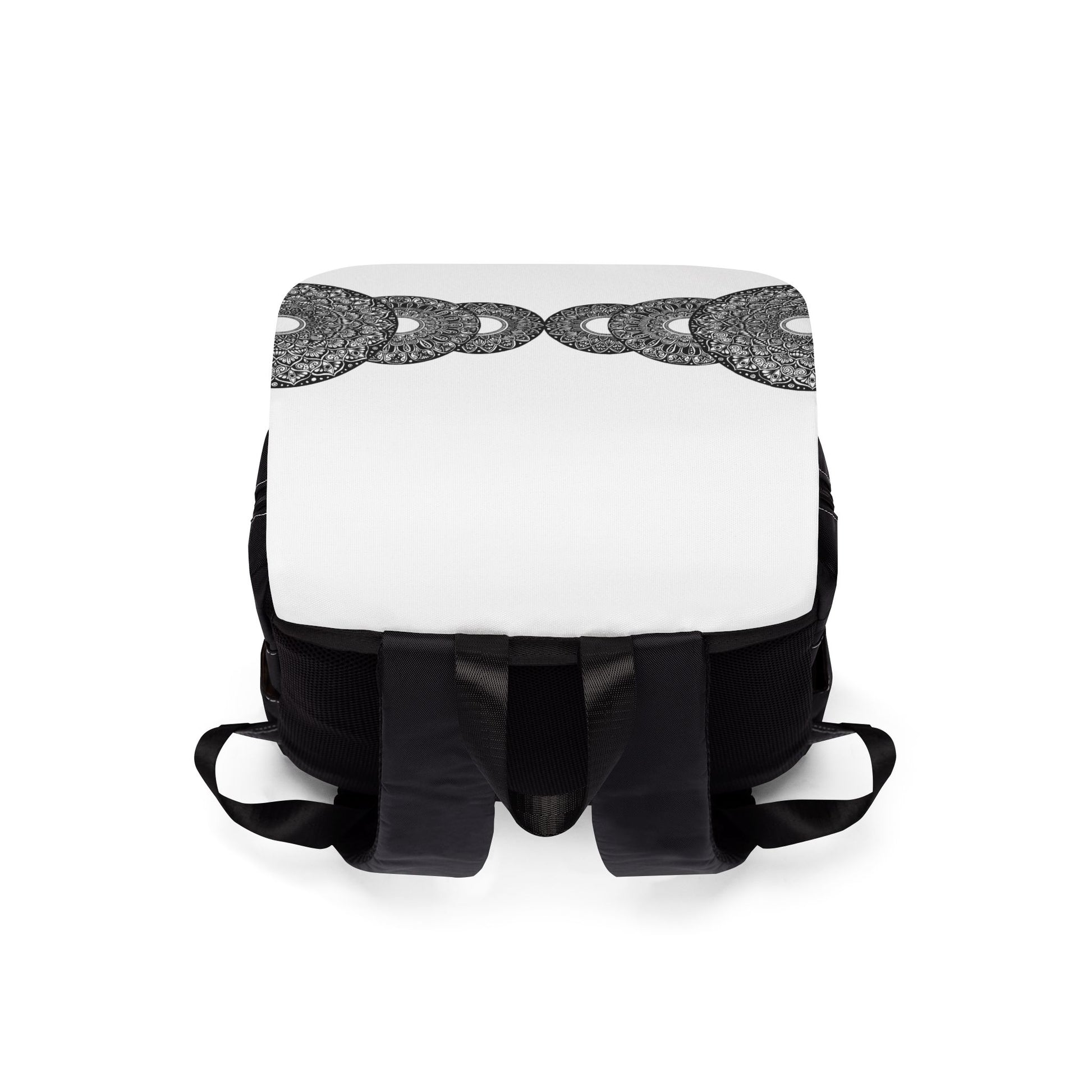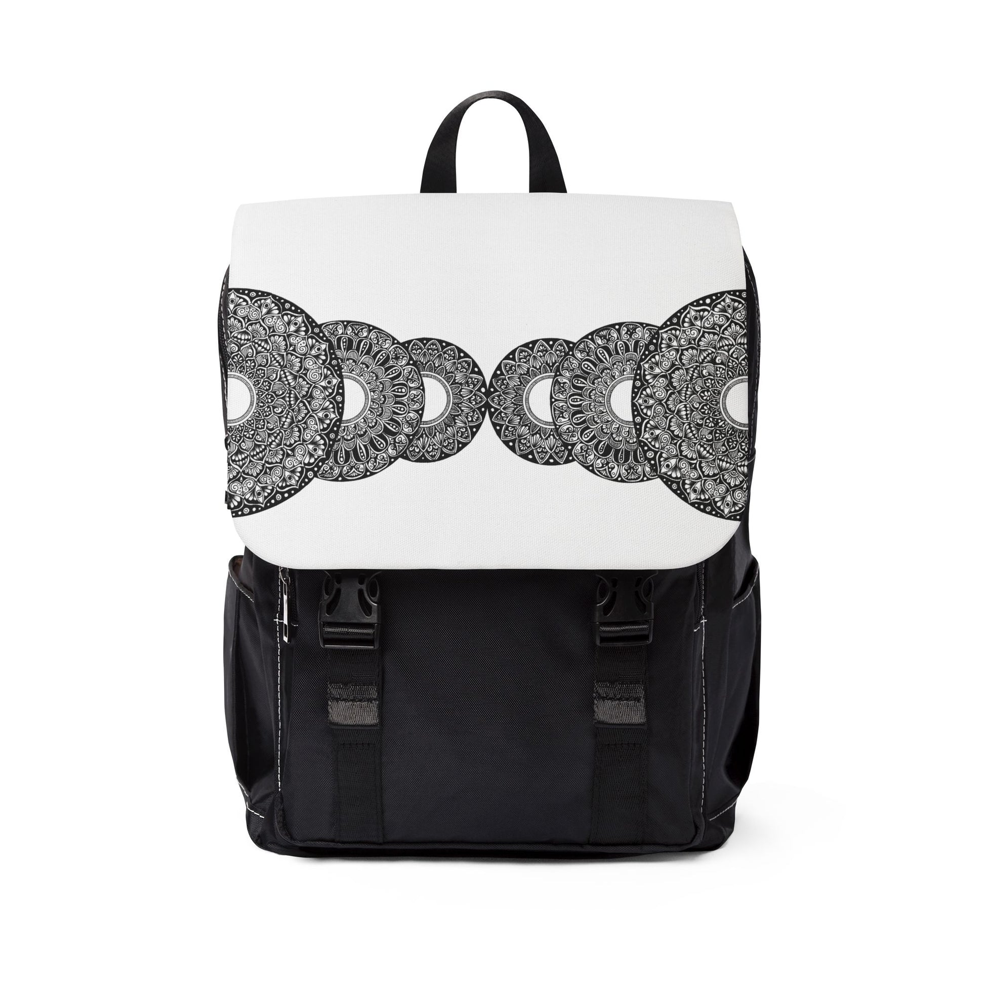Casual backpack in a classic shape with a front flap design. It is made of durable Oxford canvas. It has two slip interior pockets and one laptop sleeve in the main compartment, a front zipper pocket, and two side pockets. The surface design is an original piece of art by Chelsea Jewett, and it is a series of 6 mandalas that mirror one another from the center outwards.