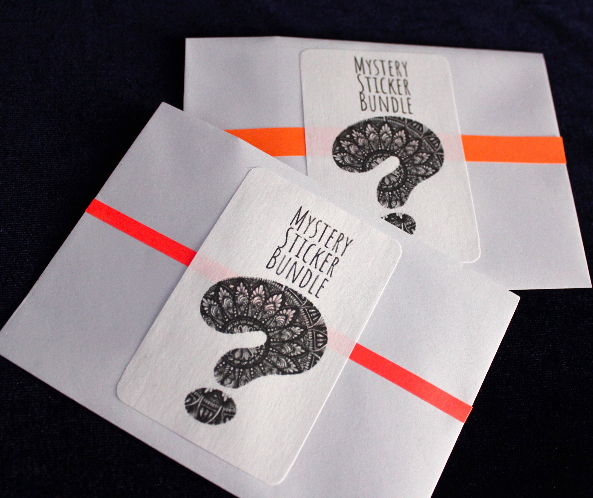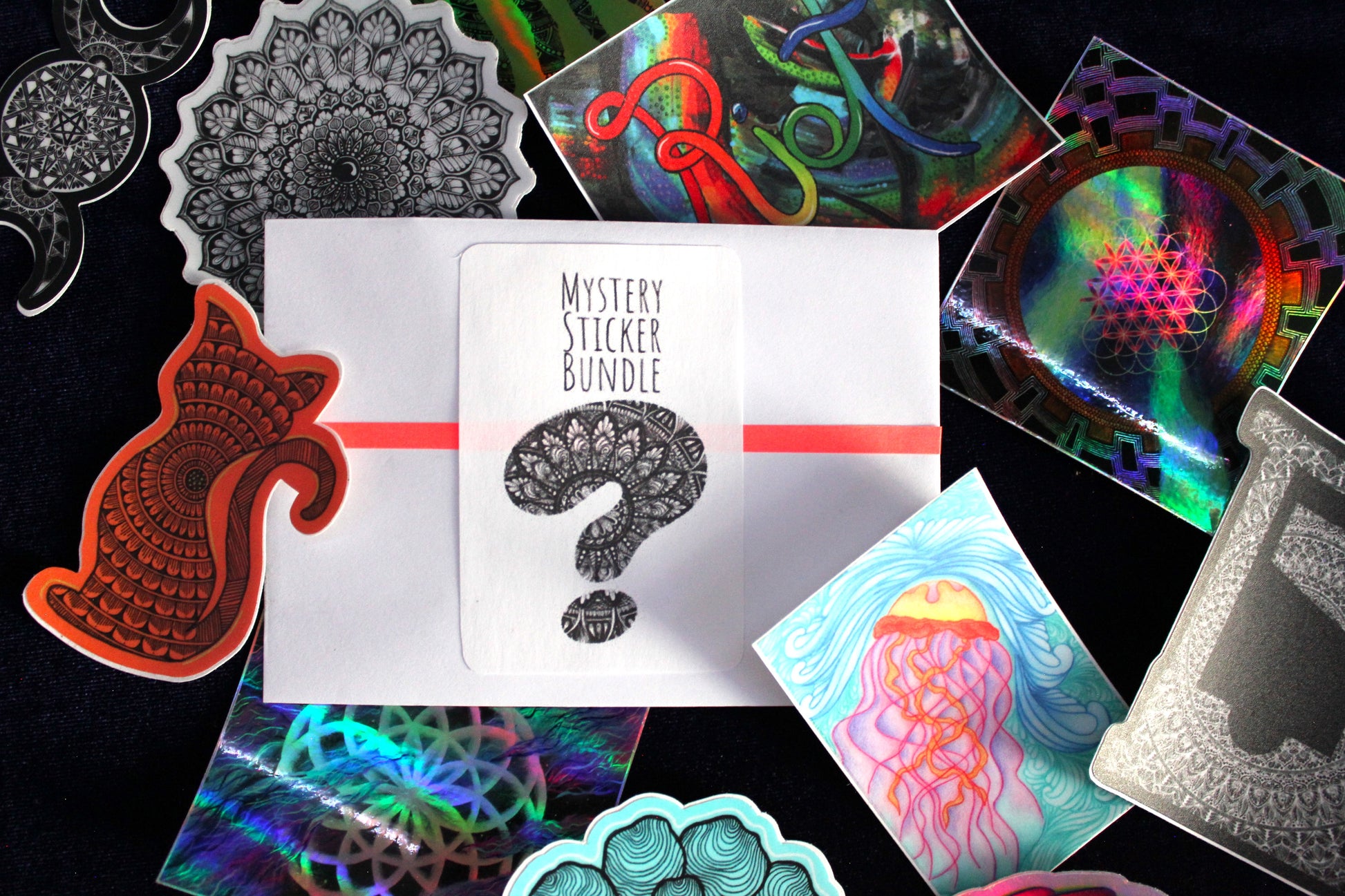 For those who like being surprised! Here's a pack of 4 mystery stickers. All of them are waterproof, vinyl, and feature original artwork. Sets can include holographic and matte stickers. There are NO repeats, you get 4 unique stickers!