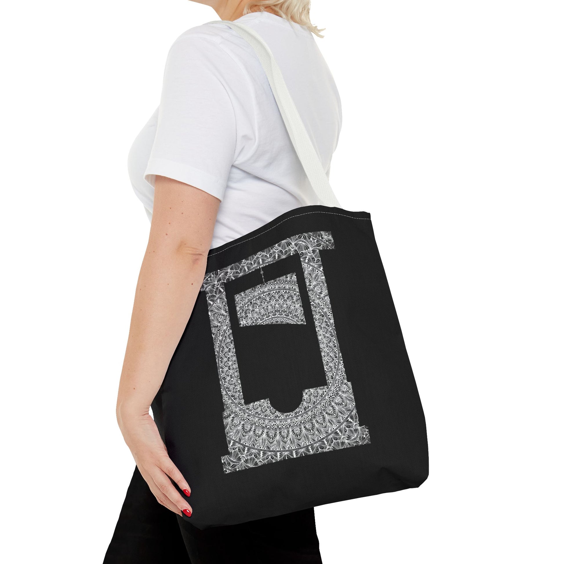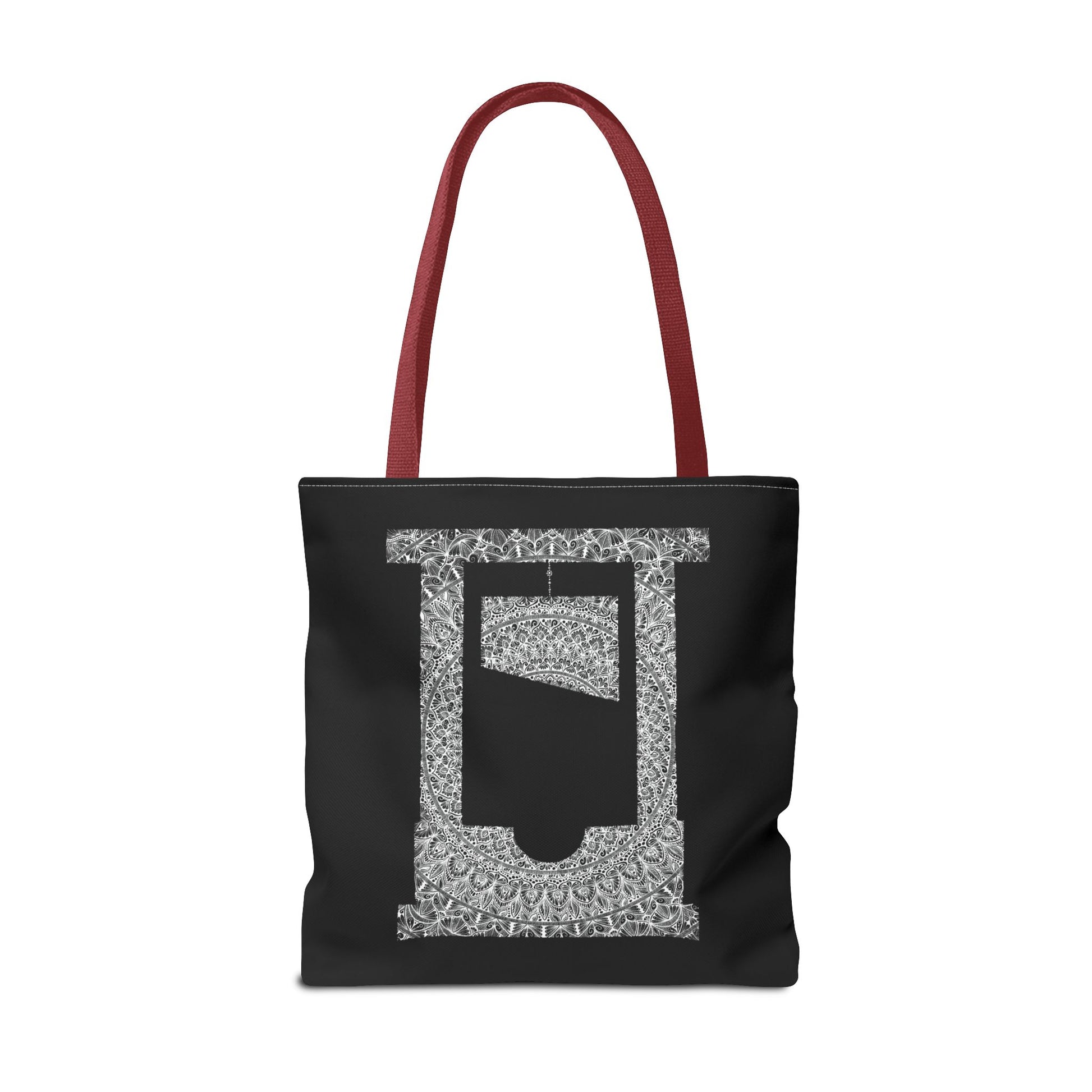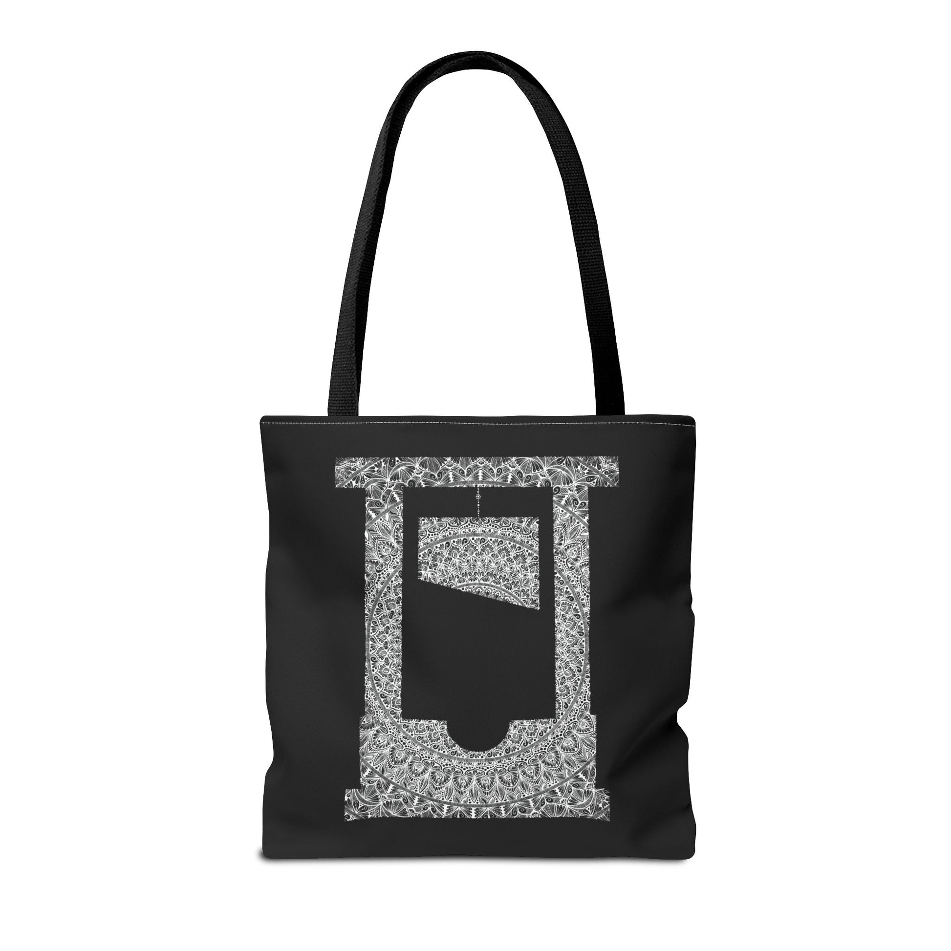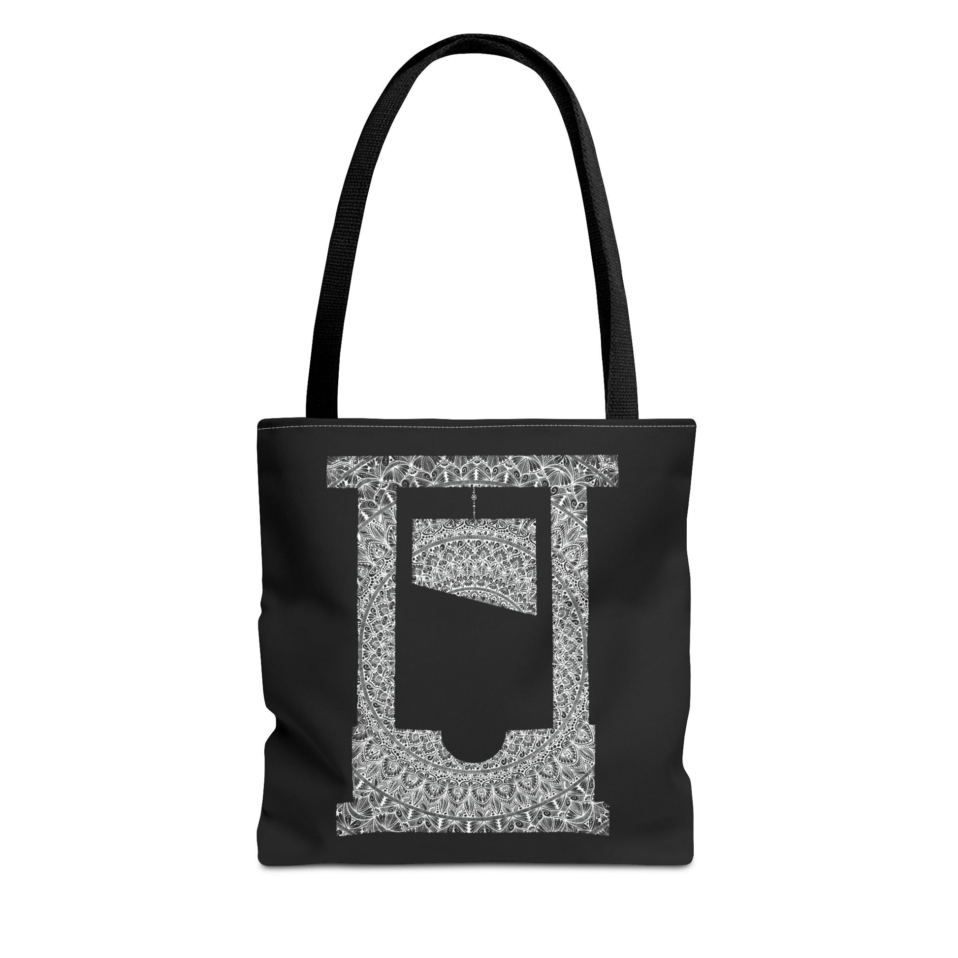 A sturdy and stylish tote bag featuring a unique Guillotine Mandala design in white on a black background, original artwork is named VIP Seating.