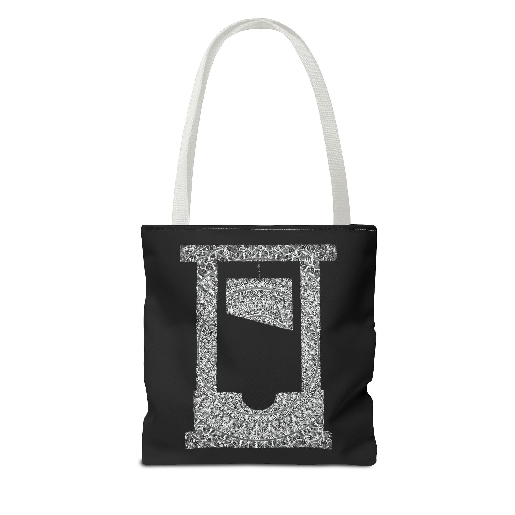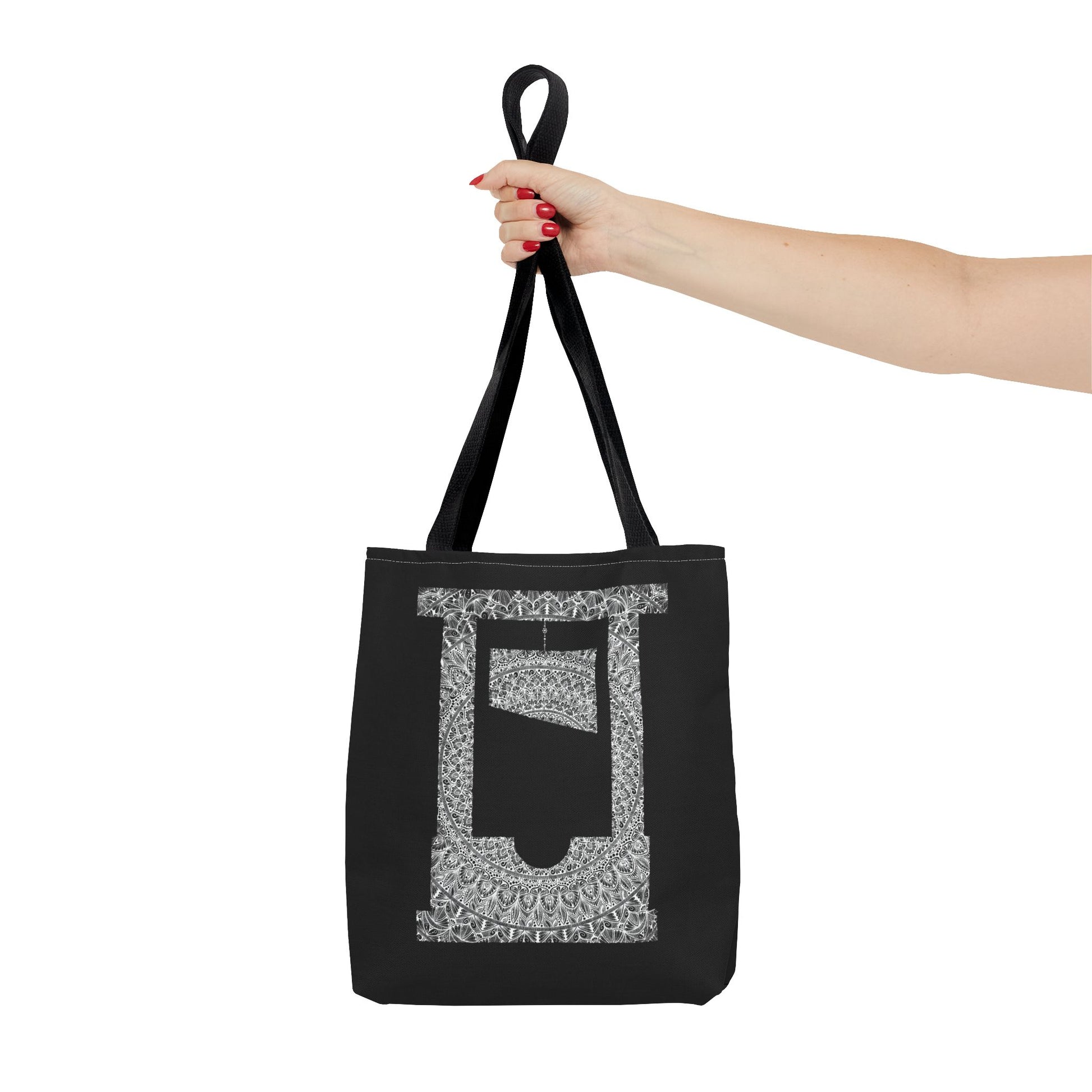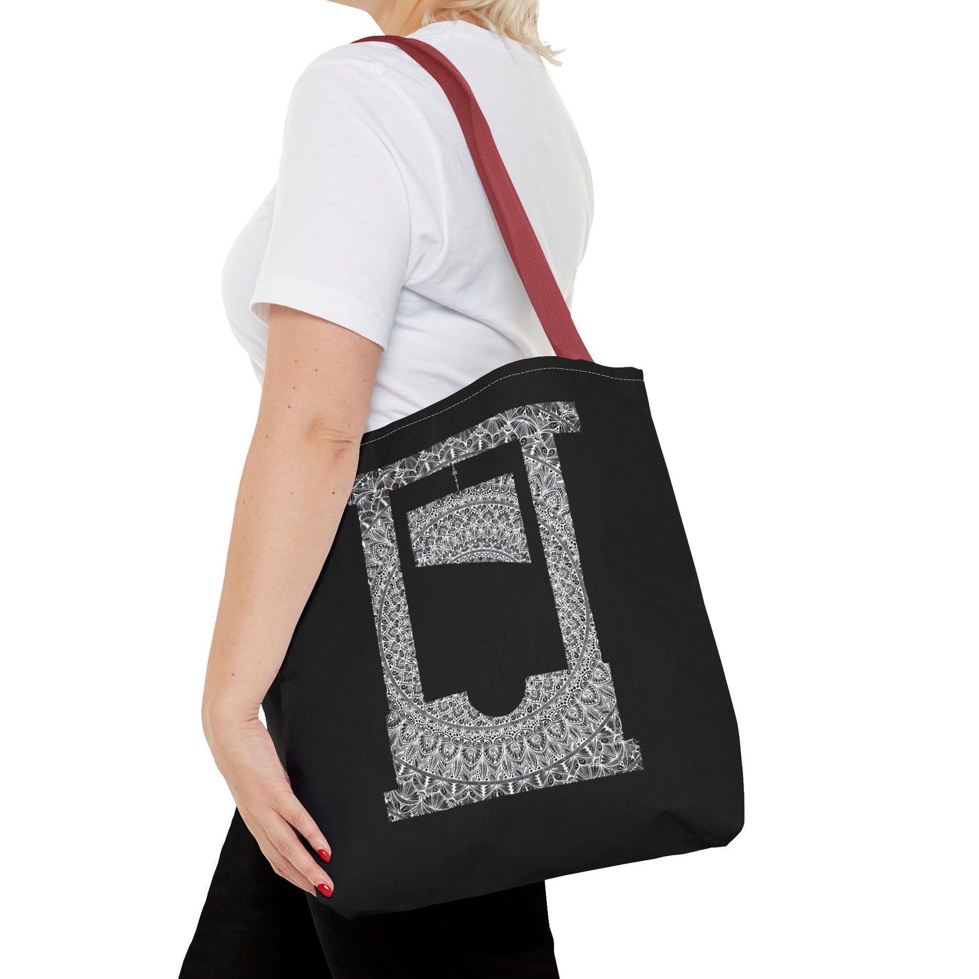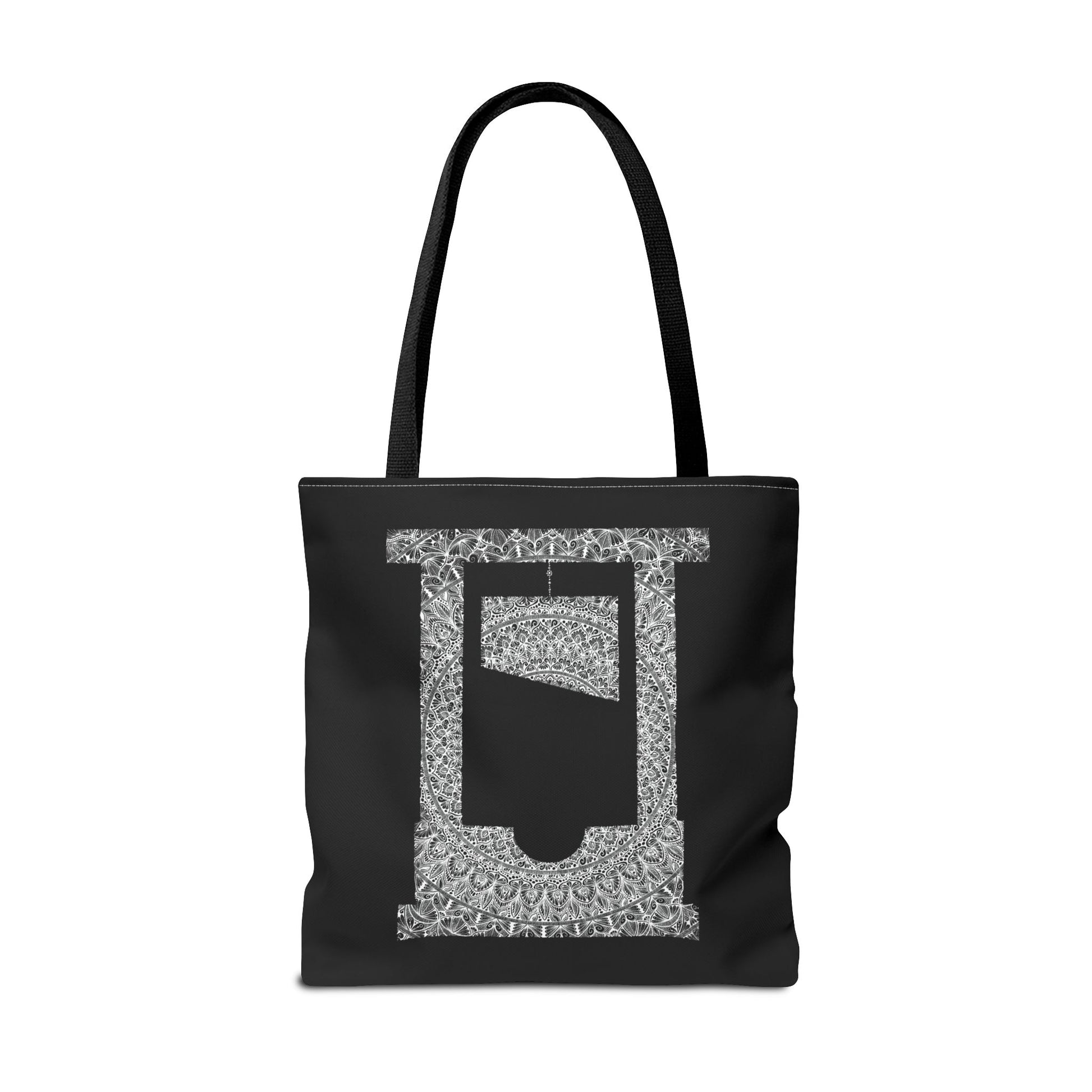 A sturdy and stylish tote bag featuring a unique Guillotine Mandala design in white on a black background, original artwork is named VIP Seating.