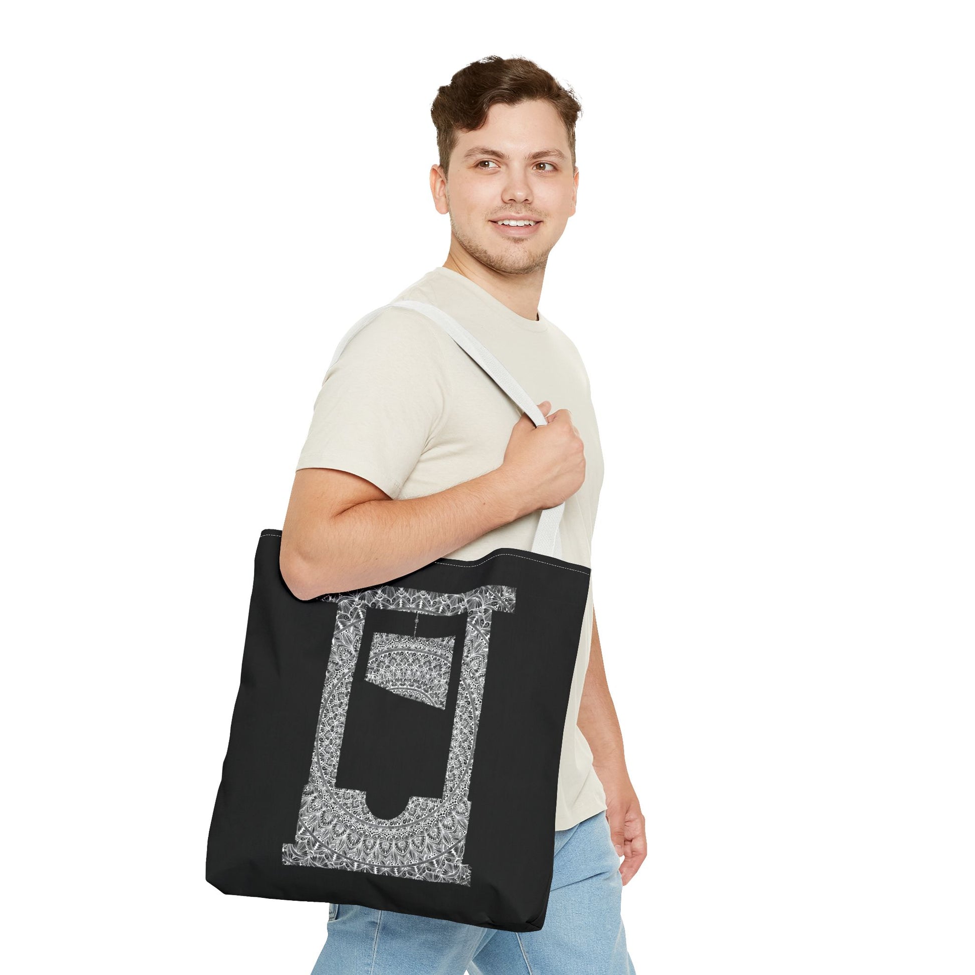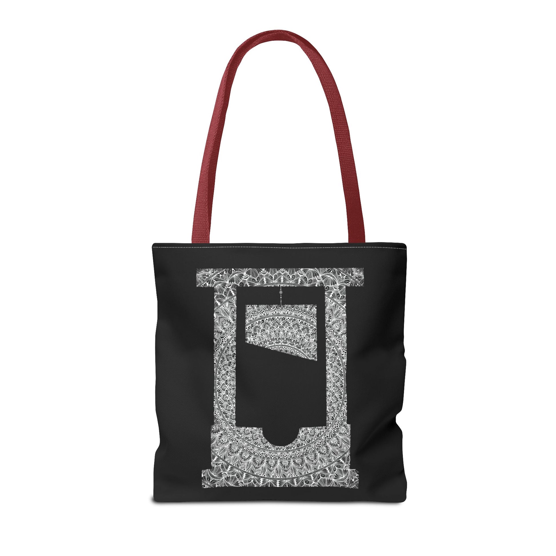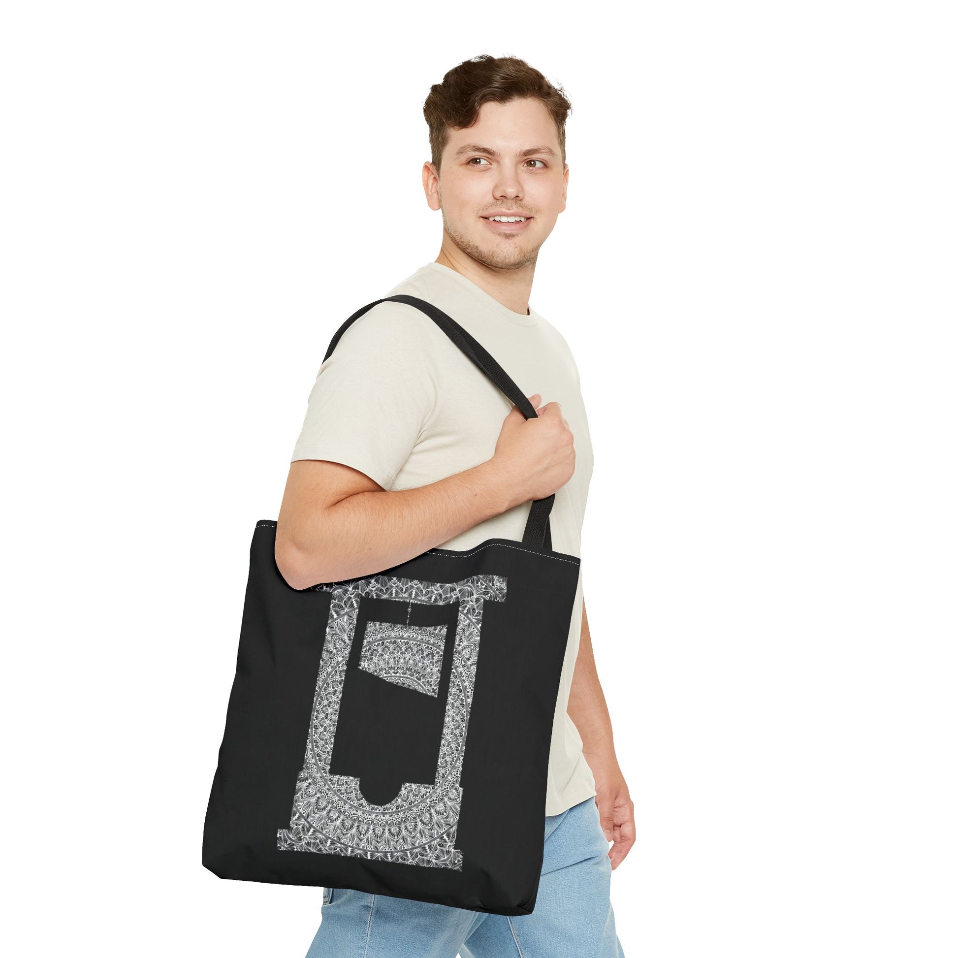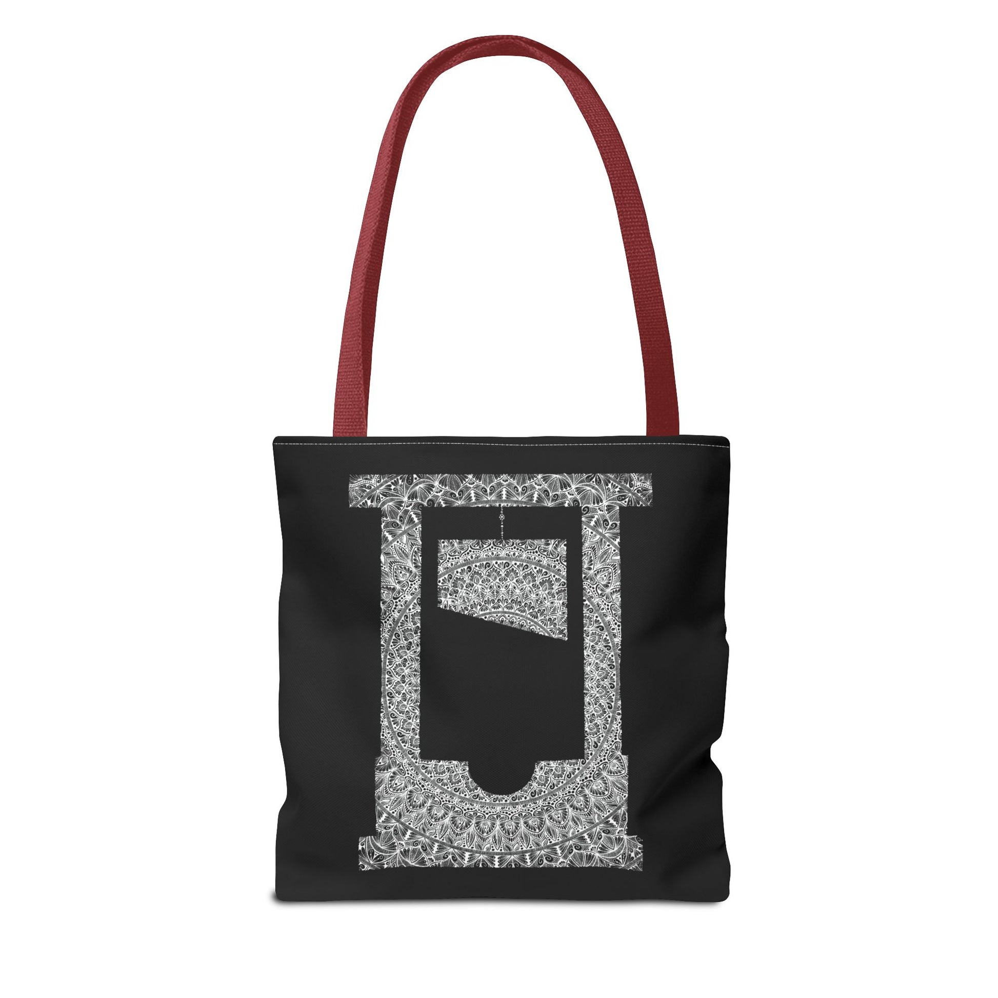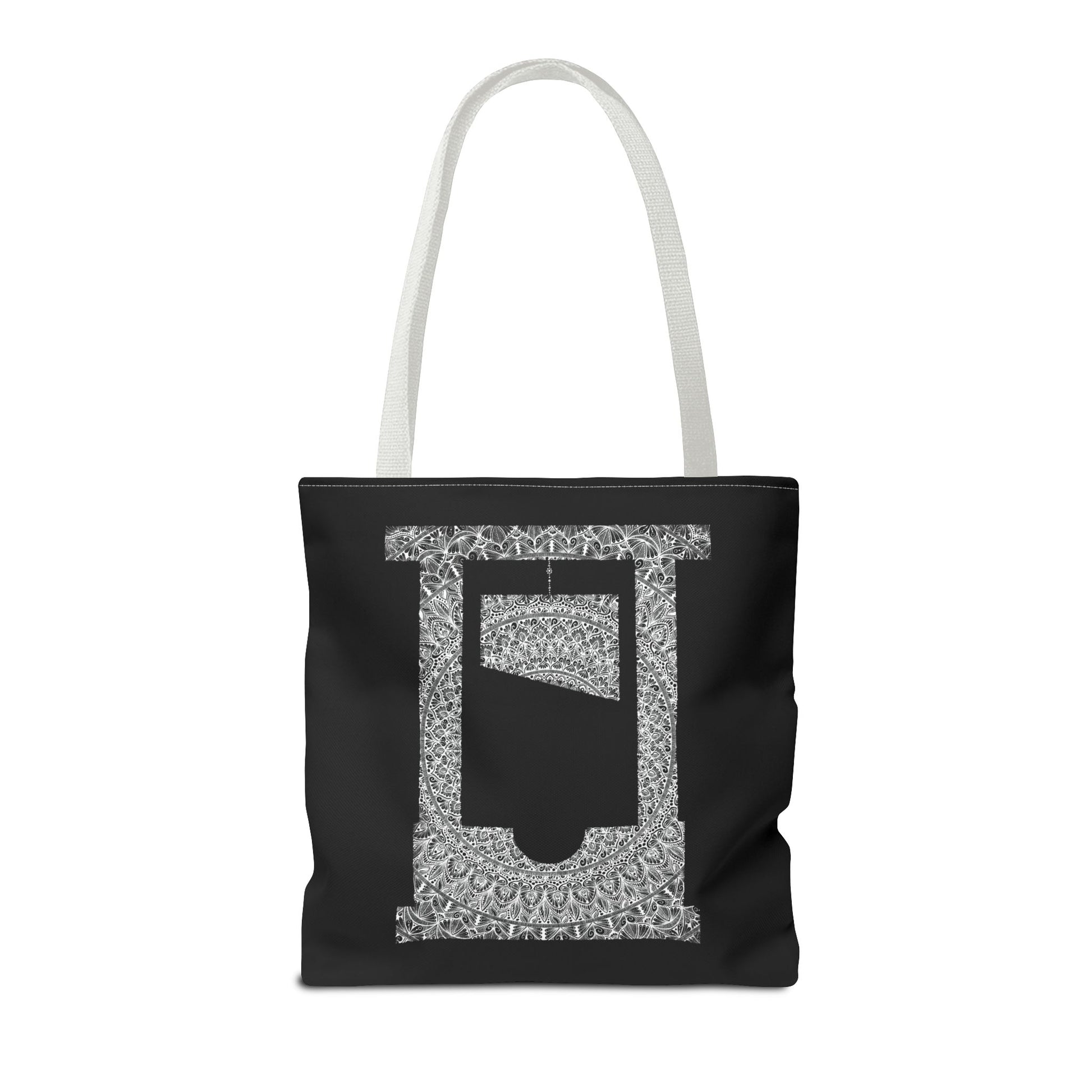 A sturdy and stylish tote bag featuring a unique Guillotine Mandala design in white on a black background, original artwork is named VIP Seating.