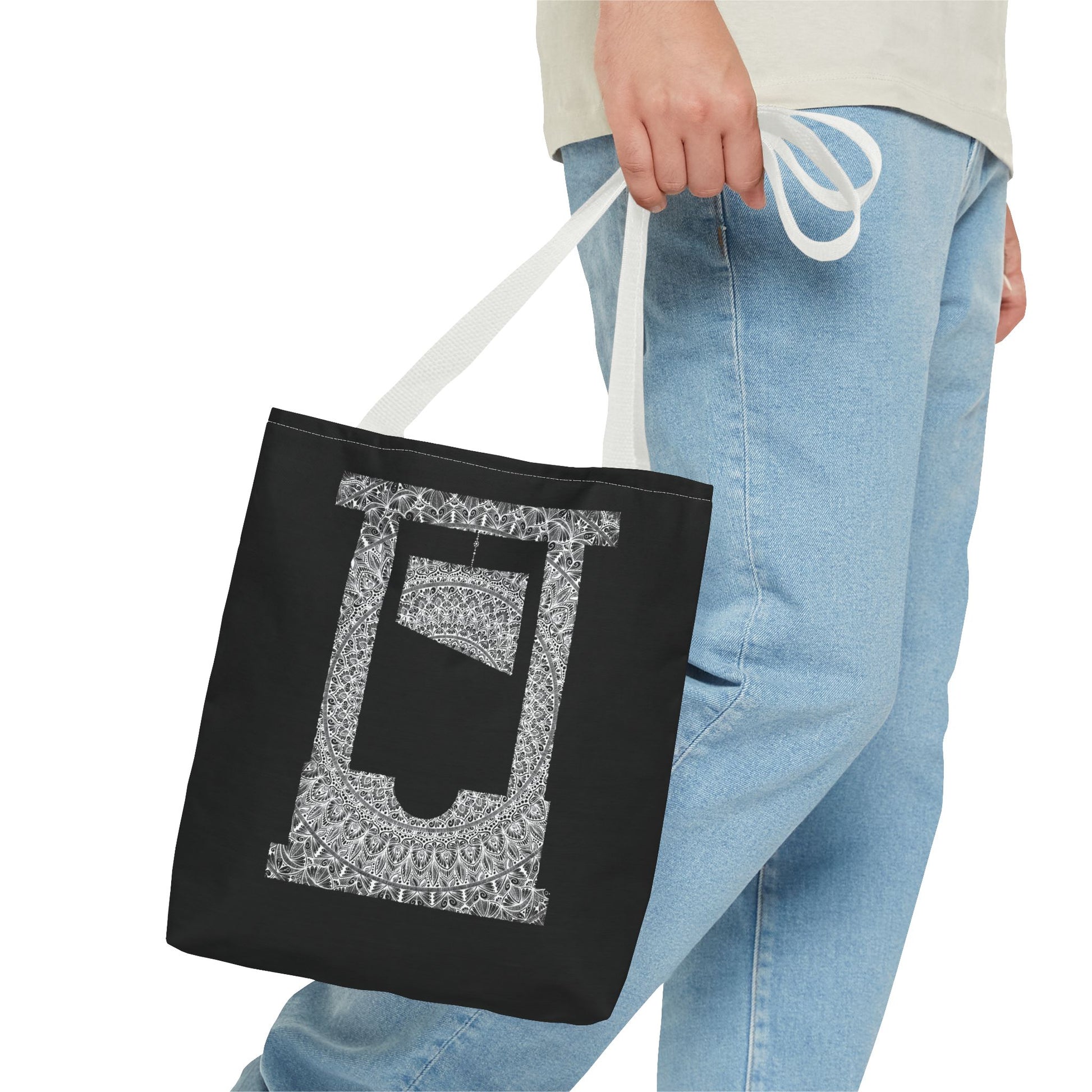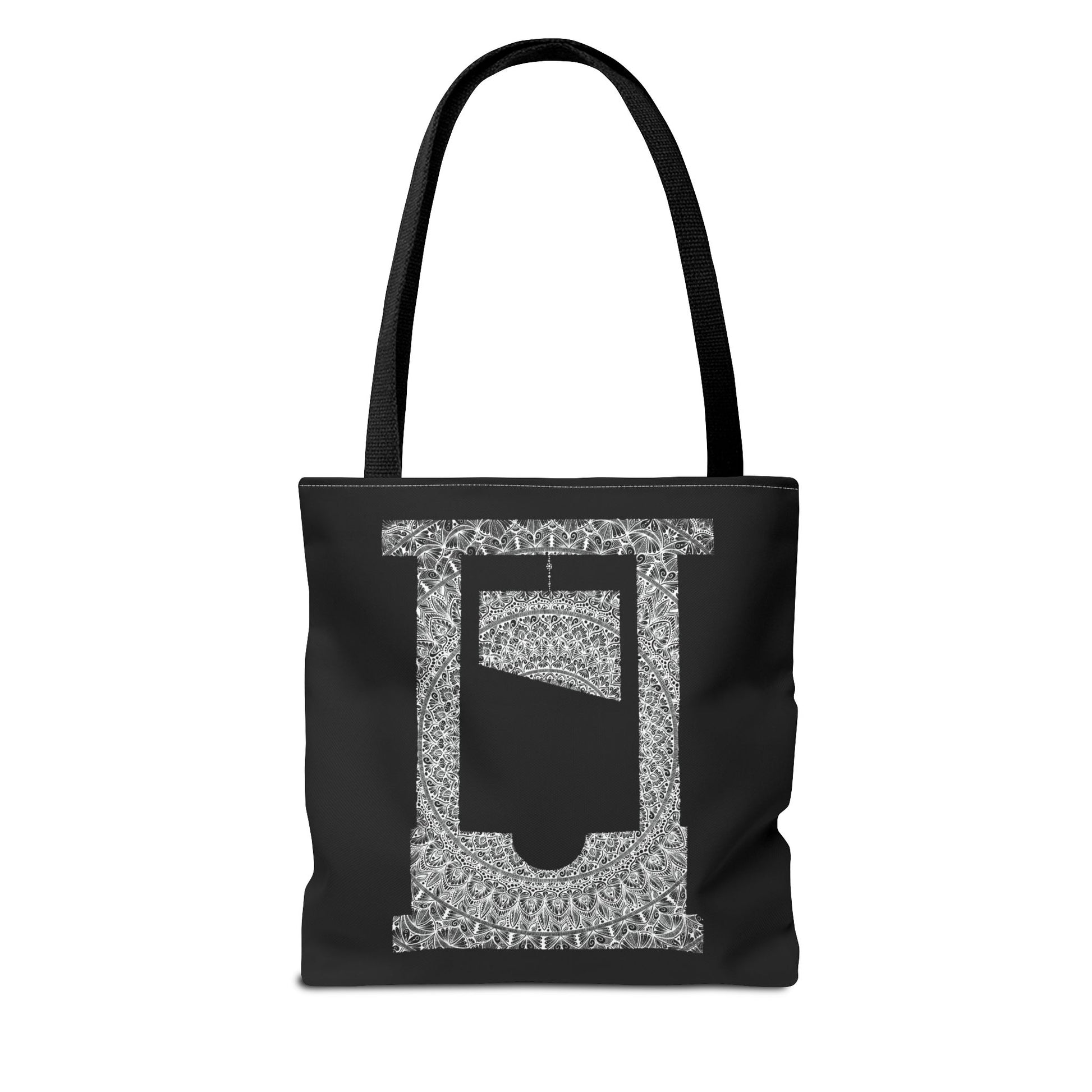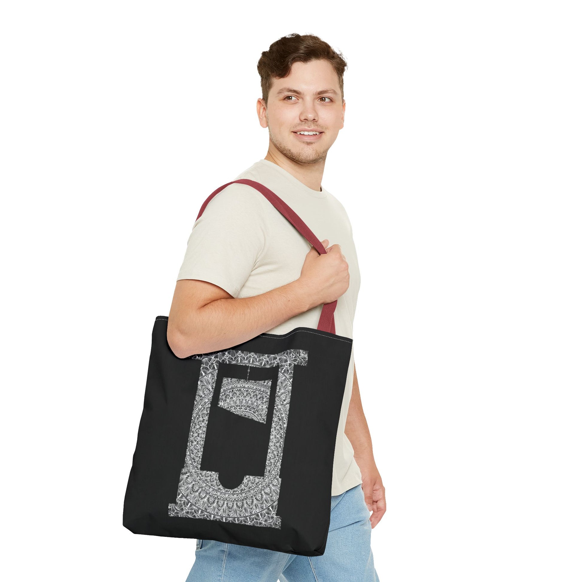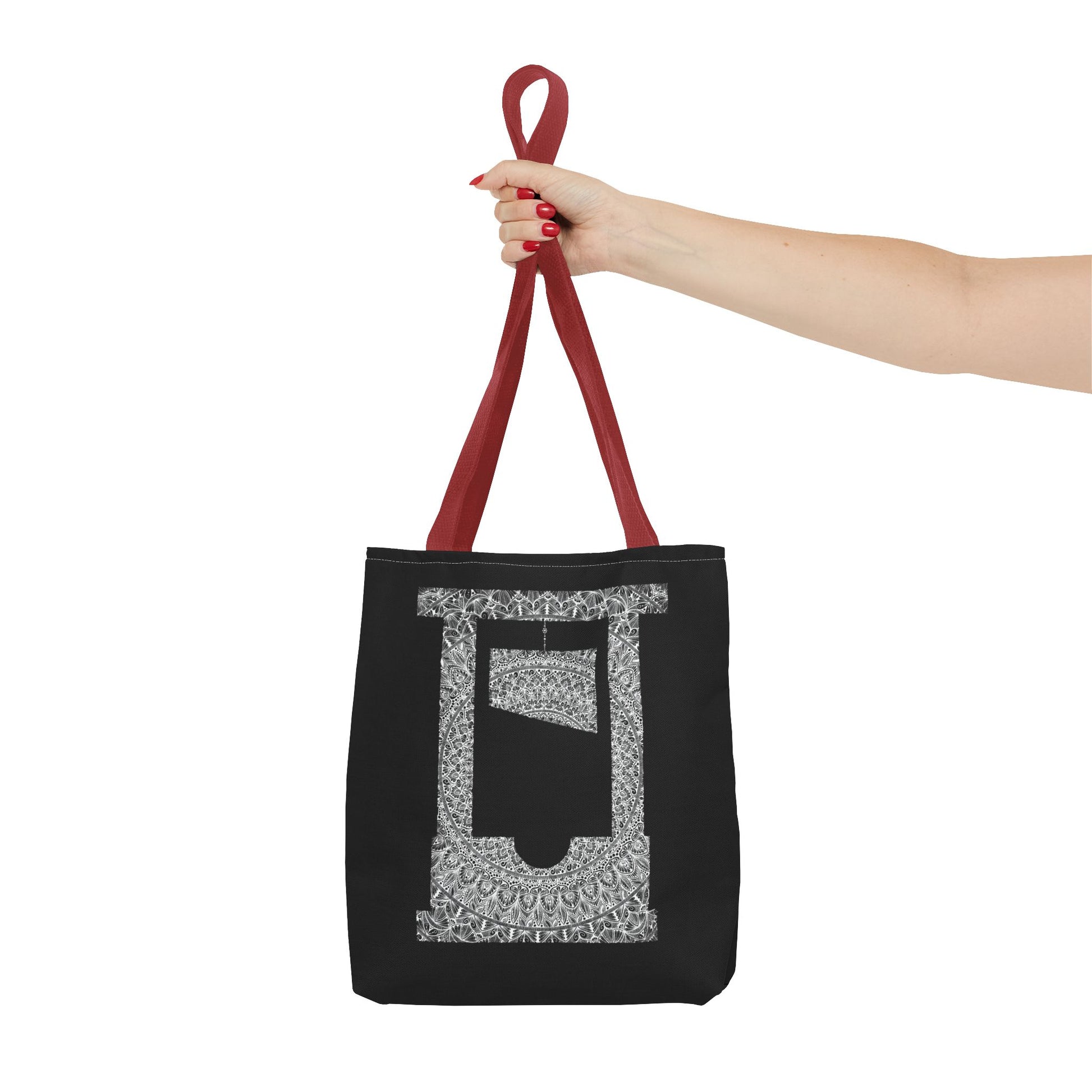 A sturdy and stylish tote bag featuring a unique Guillotine Mandala design in white on a black background, original artwork is named VIP Seating.