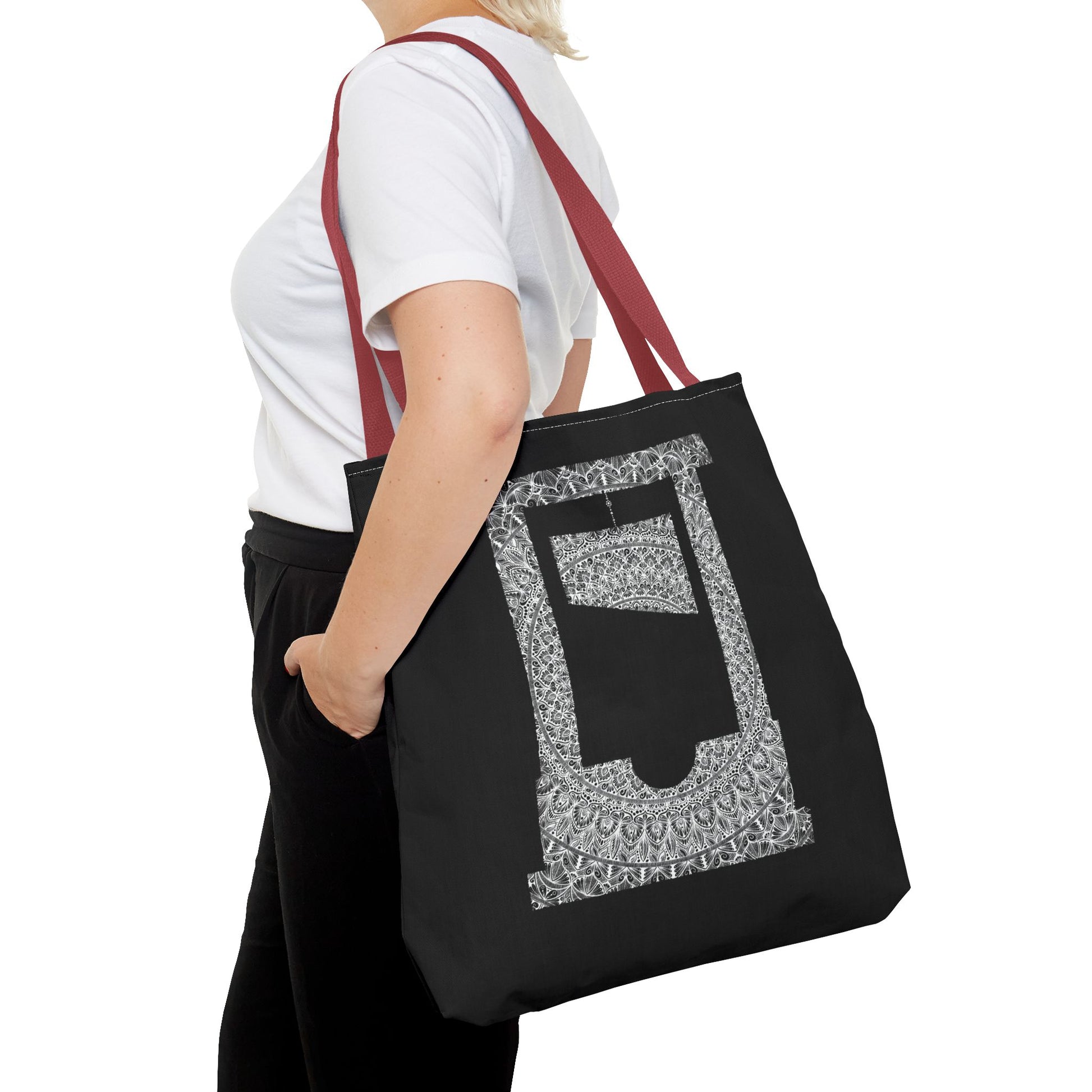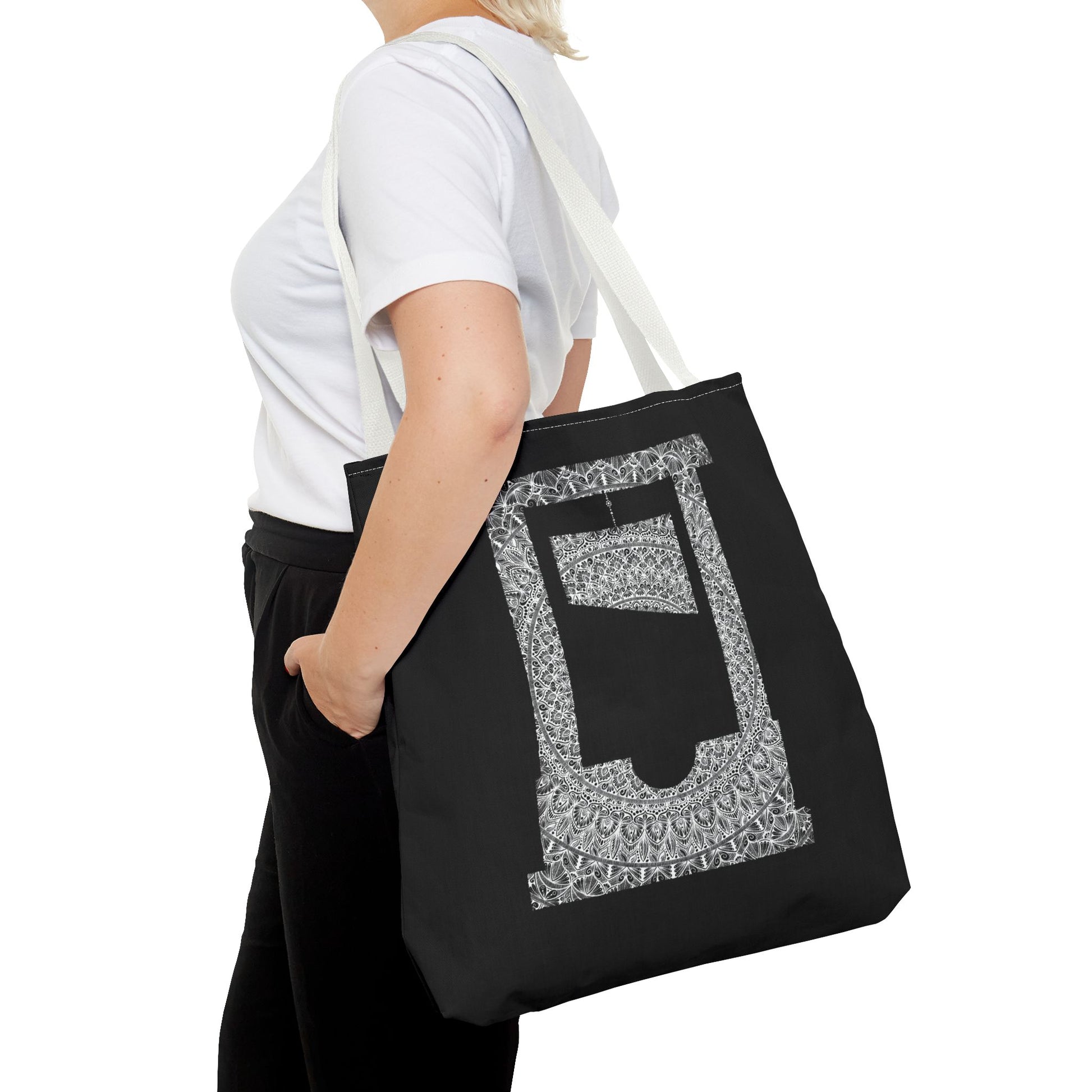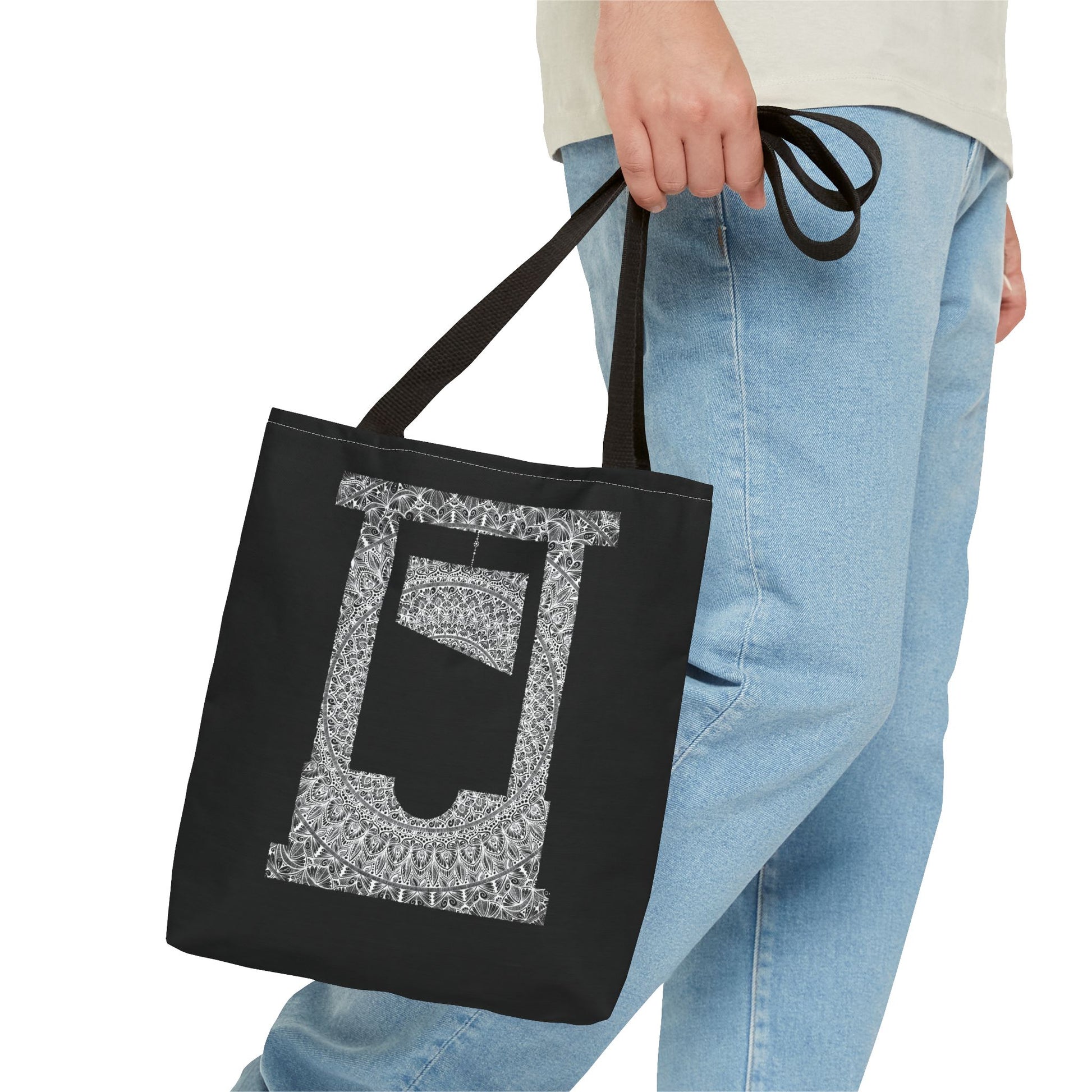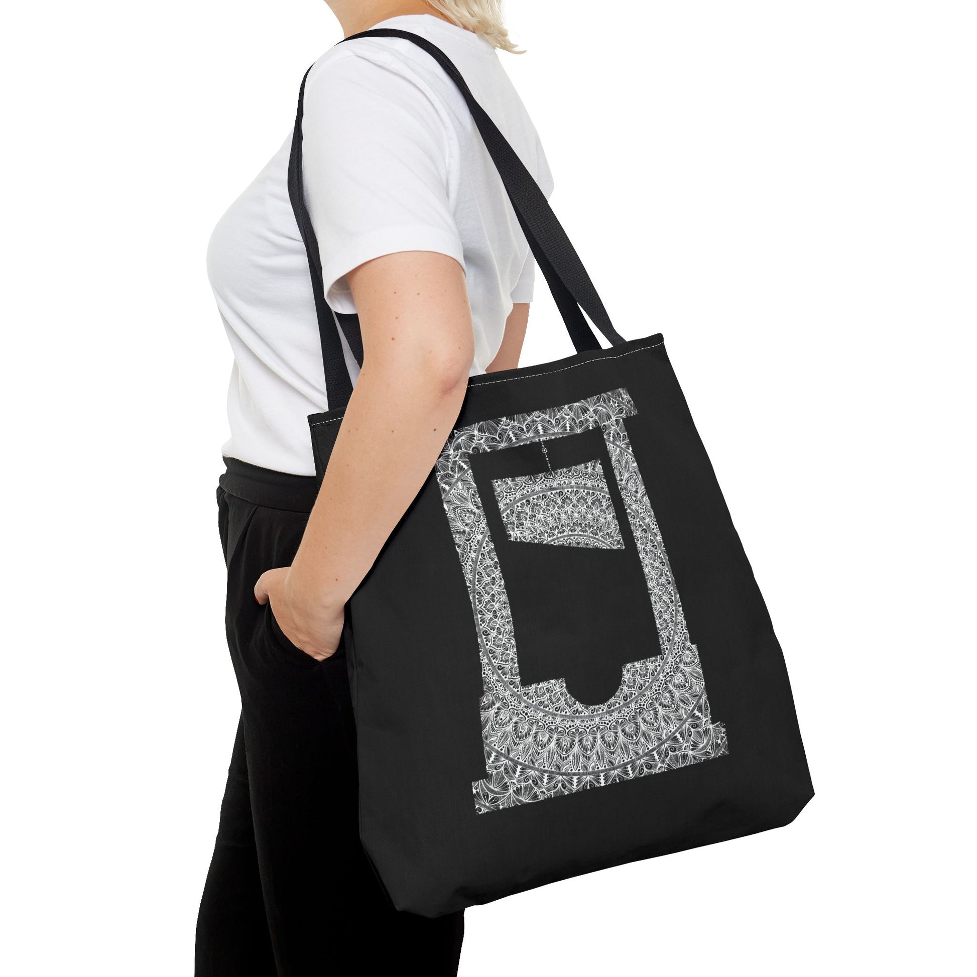 A sturdy and stylish tote bag featuring a unique Guillotine Mandala design in white on a black background, original artwork is named VIP Seating.