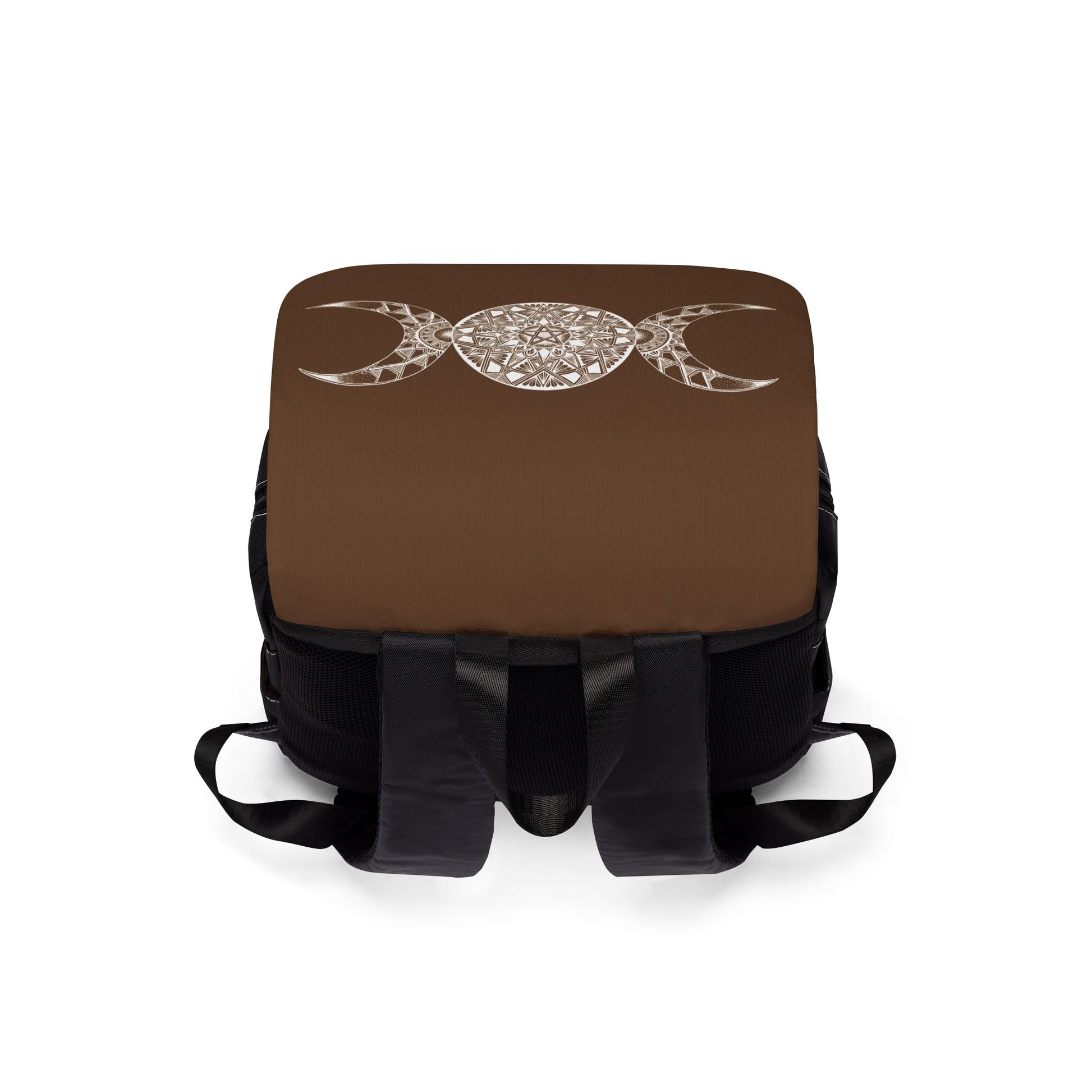 The design of this bag is perfect for your foraging hikes! The triple moon mandala is an original piece, with a pentacle in the middle. Casual backpack in a classic shape with a front flap design. It is made of durable Oxford canvas. It has two slip interior pockets and one laptop sleeve in the main compartment, a front zipper pocket, and two side pockets.