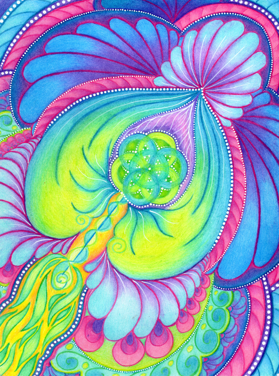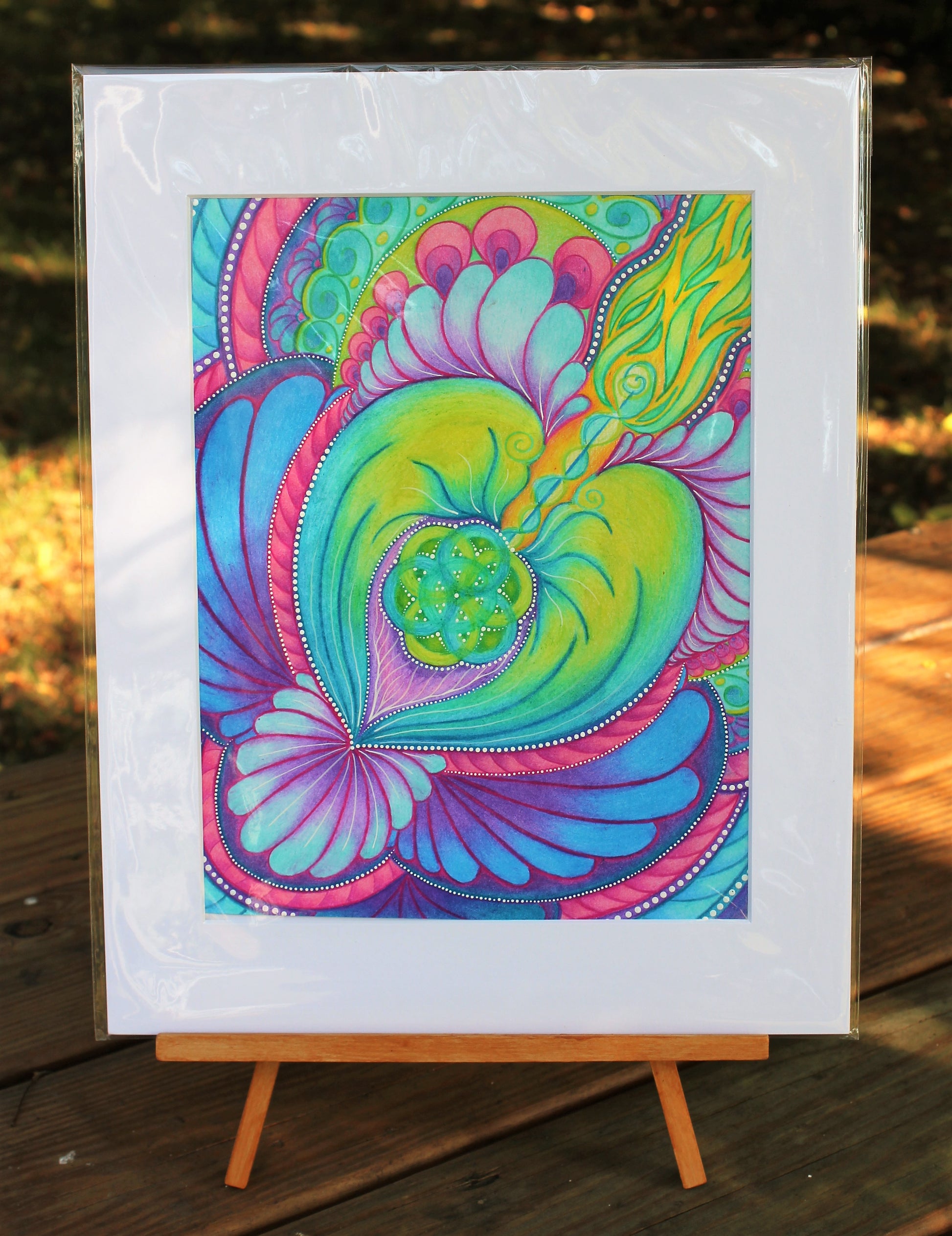 This mixed media piece radiates vibrant, playful energy while carrying a subtle feminine grace. Organic shapes flow across the composition, brought to life with a bold palette of greens, pinks, and blues that spark joy and curiosity. Matted to 11x14” with museum-quality archival materials to preserve its color and detail.